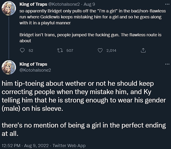 @KotohaIsone2, also under the rather fitting “King of Traps” put forward a different take. “So apparently Bridget only pulls off the ‘i’m a girl’ in the bad/non-flawless run where Goldlewis keeps mistaking him for a girl and so he goes along with it in a playful manner Bridget isn’t trans, people jumped the f—king gun.”