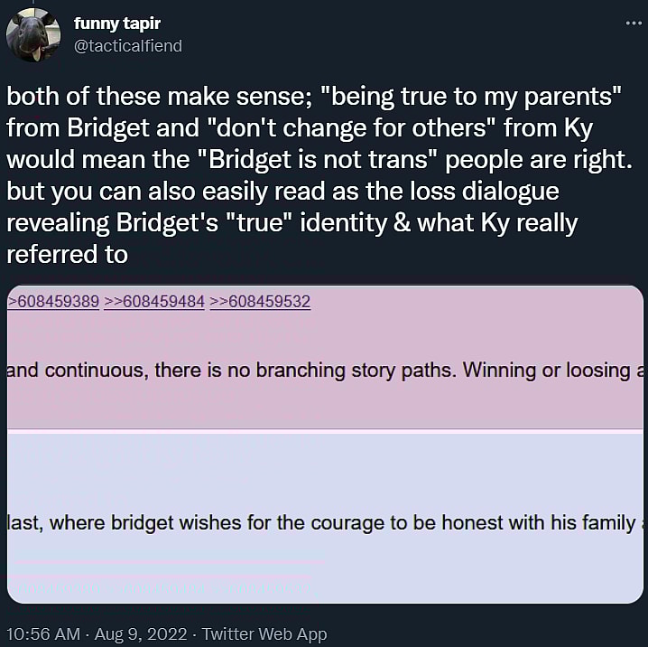 “Both of these make sense;” @tacticalfiend proposes. “‘Being true to my parents’ from Bridget and ‘don’t change for others’ from Ky would mean the ‘Bridget is not trans’ people are right. but you can also easily read as the loss dialogue revealing Bridget’s ‘true’ identity & what Ky really referred to.”