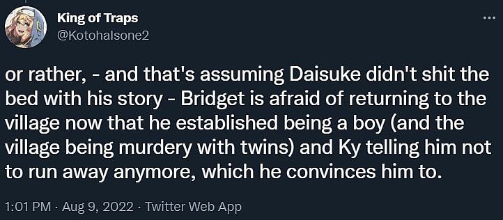 @KotohaIsone2 suggests,”or rather, – and that’s assuming Daisuke didn’t s—t the bed with his story – Bridget is afraid of returning to the village now that he established being a boy (and the village being murdery with twins) and Ky telling him not to run away anymore, which he convinces him to.”