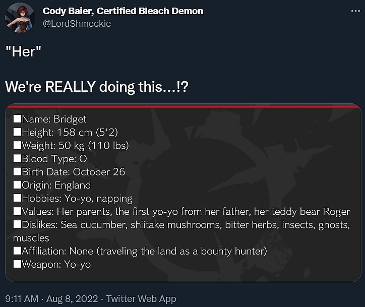 Fans also noticed the English profile avoided using any pronouns, using Bridget’s name in any such instance. Yet, other characters freely used “he” and “she” to describe the character. Machine translation of the Japanese webpage was inconclusive, as pronouns are not accurately translated at the best of times.