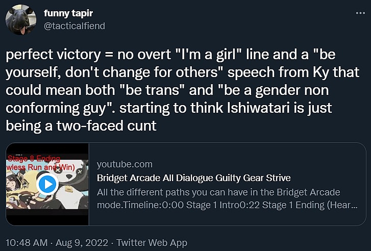 Kotaku, Polygon, Vice, The Gamer, Inverse, Fanbyte, GamesRadar, Gamer Braves, Gayming Mag, and more all ran articles mentioning or outright celebrating Bridget as “coming out” transgender, and as a symbol of representation. It wouldn’t be out of character for ArcSystemWorks to make the change, either.