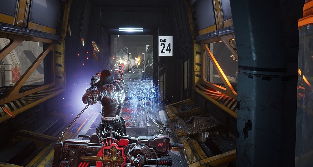 This means that the only way out is through, leaving players to shoot the enemies oneself or occasional splatter them on the level’s environmental obstacles.