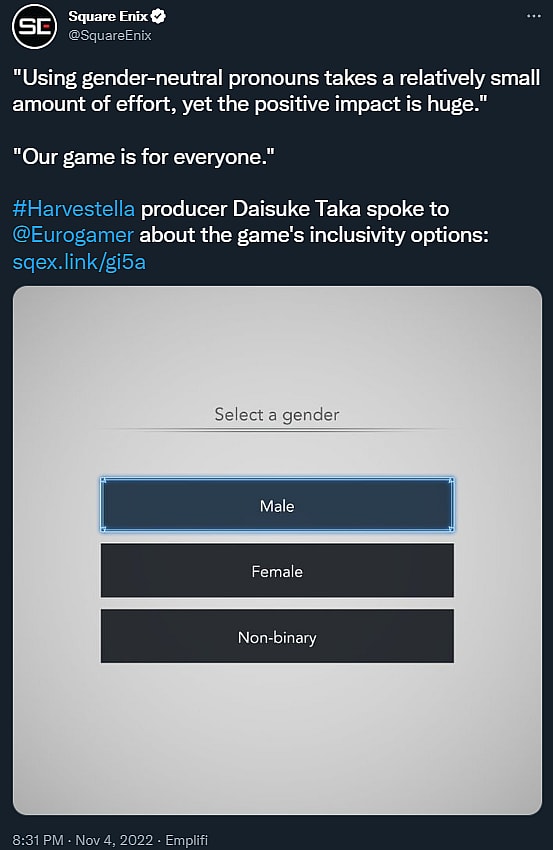 Taka’s comments seemingly had the full-throated support of Square Enix, who shared the interview on Twitter. Along with showing the gender selection part of the character creator. Square Enix focused on two key quotes; “Using gender-neutral pronouns takes a relatively small amount of effort, yet the positive impact is huge,” and “Our game is for everyone.”