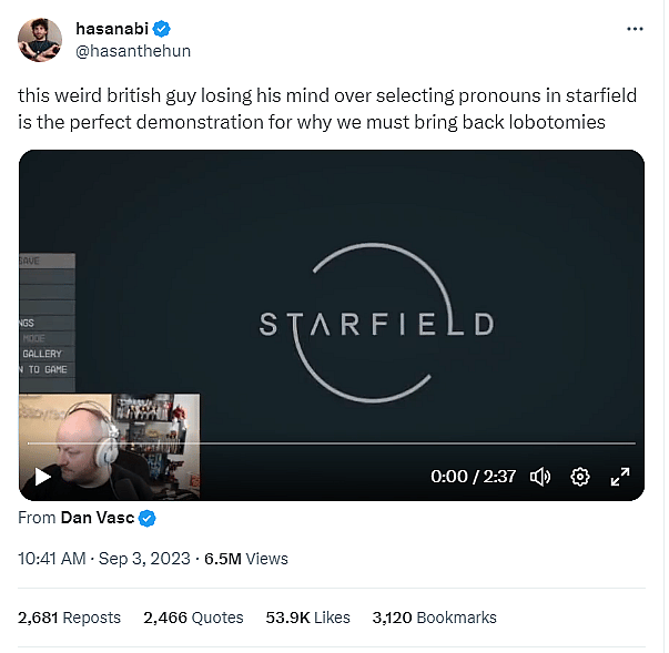 In response to this rant, Piker posted to X writing, “this weird british guy losing his mind over selecting pronouns in Starfield is the perfect demonstration for why we must bring back lobotomies.”