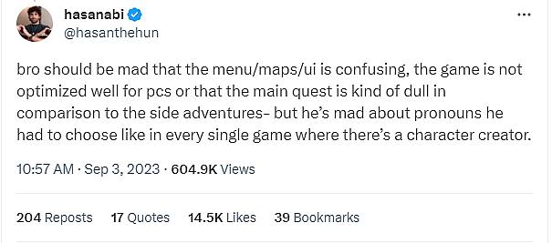 In a follow-up, Piker disingenuously wrote, “bro should be mad that the menu/maps/ui is confusing, the game is not optimized well for pcs or that the main quest is kind of dull in comparison to the side adventures- but he’s mad about pronouns he had to choose like in every single game where there’s a character creator.”