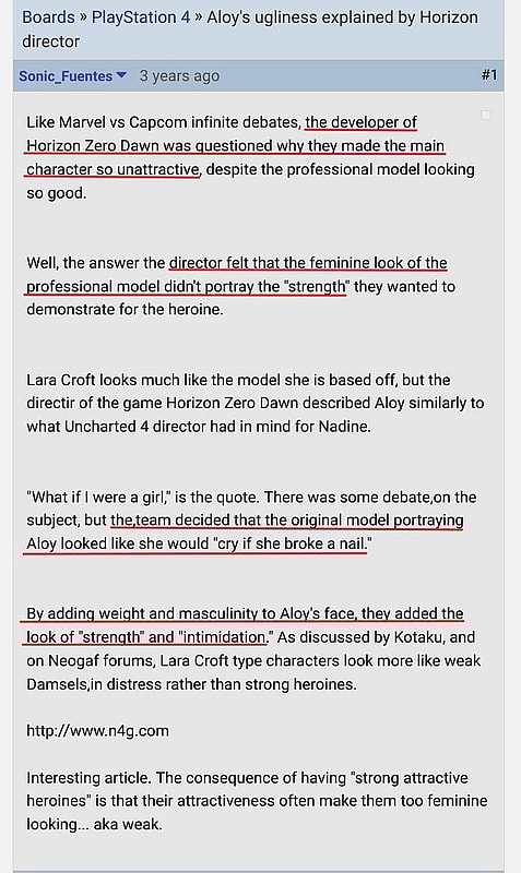 A widely-circulated screen cap from a GameFaqs thread (seen below) asserts that Horizon Zero Dawn director Mathijs de Jonge once stated in an interview that the feminine look of [Hoekstra] didn’t portray the “strength” they wanted.
