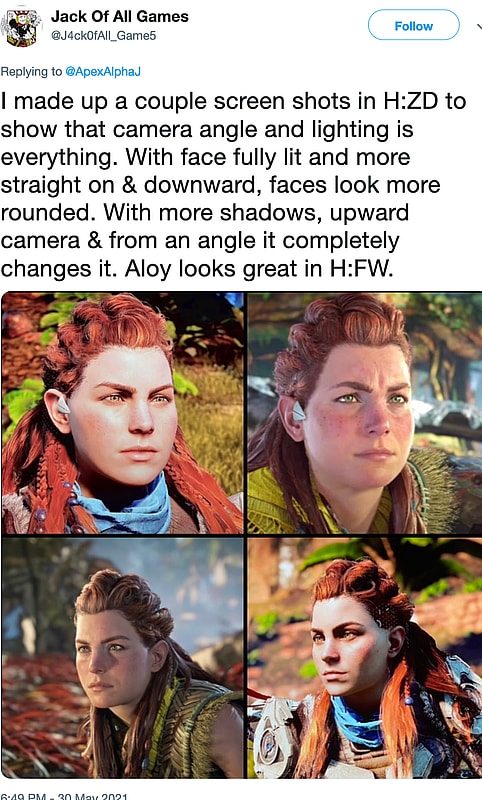 A third camp, agnostic in their belief as to whether Guerilla Games had actually changed Aloy’s model, contended that her unflattering appearance in the game play reveal trailer was the result of camera angles and lighting.