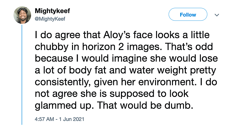 “I do agree that Aloy’s face looks a little chubby in horizon 2 images,” wrote YouTuber @MightyKeef. “That’s odd because I would imagine she would lose a lot of body fat and water weight pretty consistently, given her environment. I do not agree she is supposed to look glammed up. That would be dumb.”