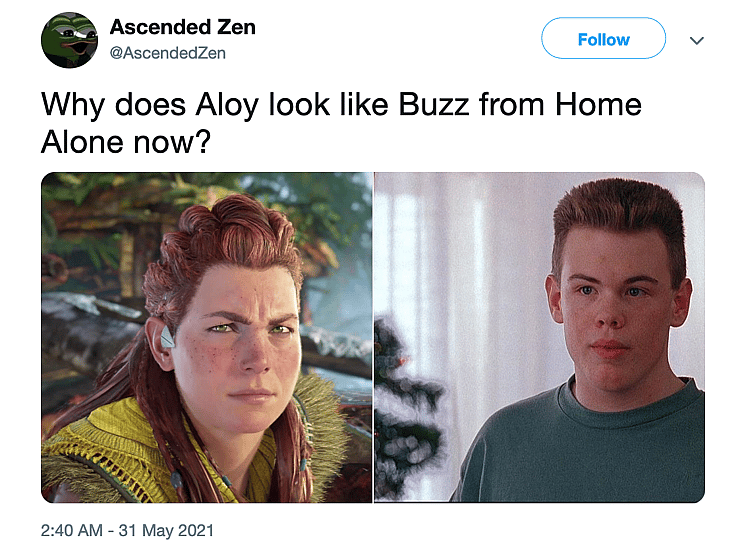 Similarly, @AscendedZen questioned, “Why does Aloy look like Buzz from Home Alone now?”