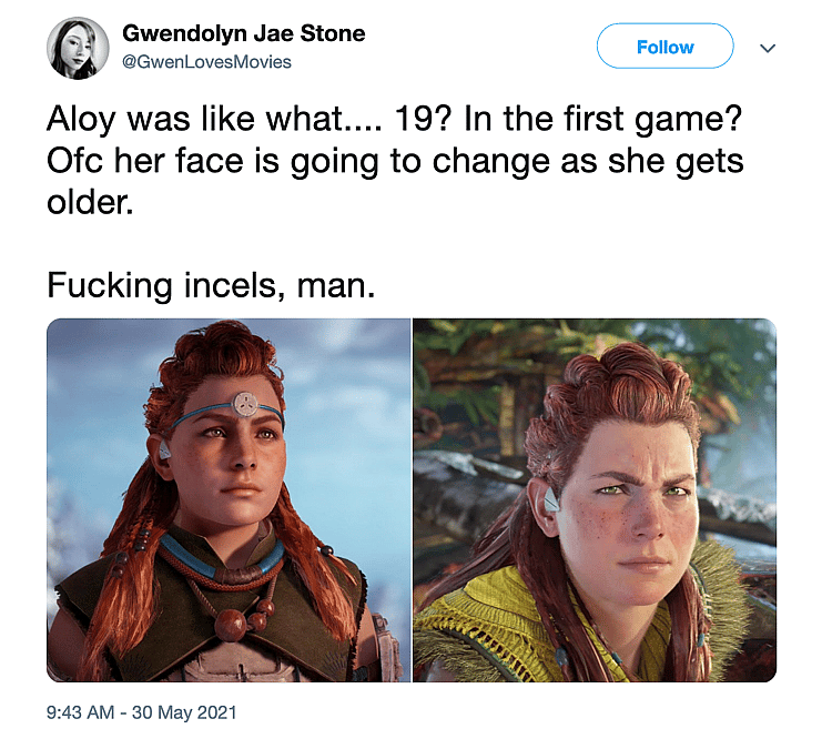 “Aloy was like what…. 19? In the first game?”, said @GwenLovesMovies. “Ofc her face is going to change as she gets older. F—-ing incels, man.”