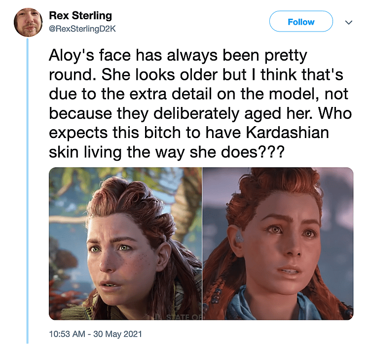 “Aloy’s face has always been pretty round. She looks older but I think that’s due to the extra detail on the model, not because they deliberately aged her,” held @RexSterlingD2K. “Who expects this b—-h to have Kardashian skin living the way she does???”