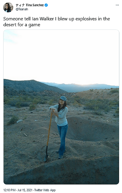 Lead producer for the recently founded Gravity Well development studio Tina Sanchez, whose resume includes credits for God of War (2018) and Apex Legends, posted a photo of herself standing triumphantly amongst an explosives range alongside the caption, “Someone tell Ian Walker I blew up explosives in the desert for a game.”