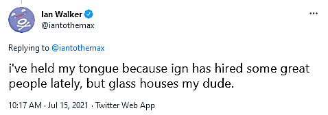 “But i’m glad you had a good time palling around with glen (who, again, if you had read the blog, is someone i highly respect),” he added. “i’ve held my tongue because ign has hired some great people lately, but glass houses my dude.”