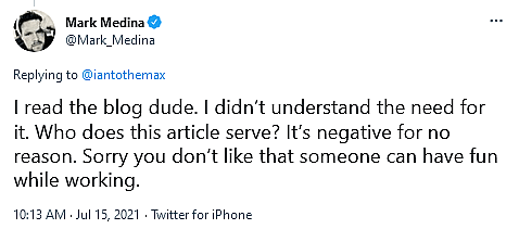 “Sorry you don’t like that someone can have fun while working,” he concluded, explaining, “I think the only case you’d have is if he said ‘I worked harder than everyone else’ which he doesn’t, and wouldn’t say.’”