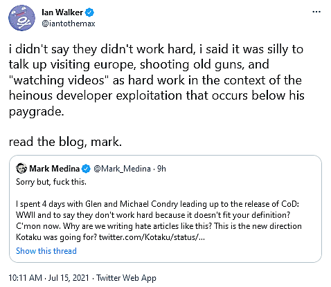 Later that same day, Walker would respond to Medina’s thread by ‘correcting’ his mainstream video games media peer, retorting, “i didn’t say they didn’t work hard, i said it was silly to talk up visiting europe, shooting old guns, and ‘watching videos’ as hard work in the context of the heinous developer exploitation that occurs below his paygrade.”