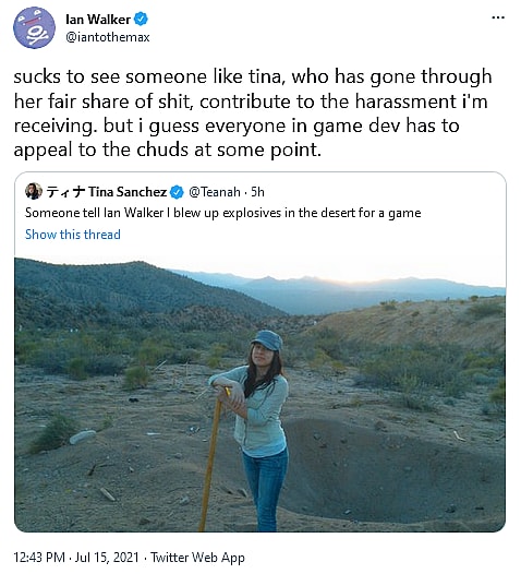 “sucks to see someone like tina, who has gone through her fair share of shit, contribute to the harassment i’m receiving,” responded Walker. “but i guess everyone in game dev has to appeal to the chuds at some point.”