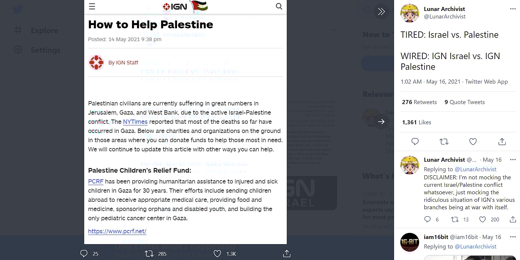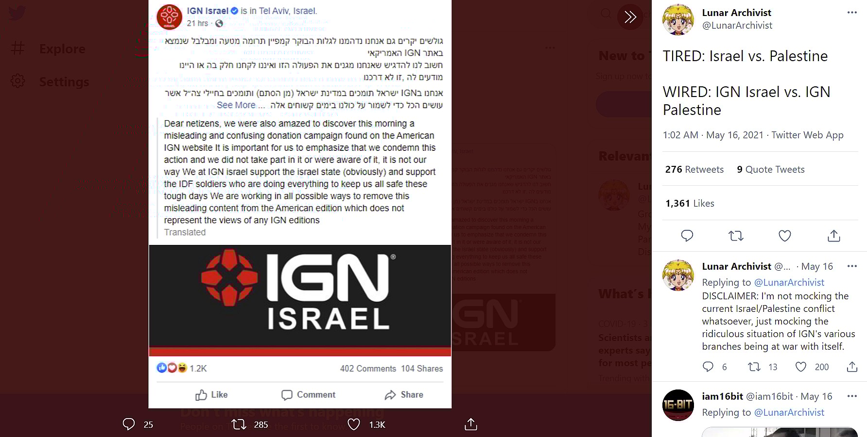 IGN posted to the company’s main website a post by IGN staff on May 14, 2021 where it appeared the company had taken sides in the conflict, choosing Palestine over Israel.