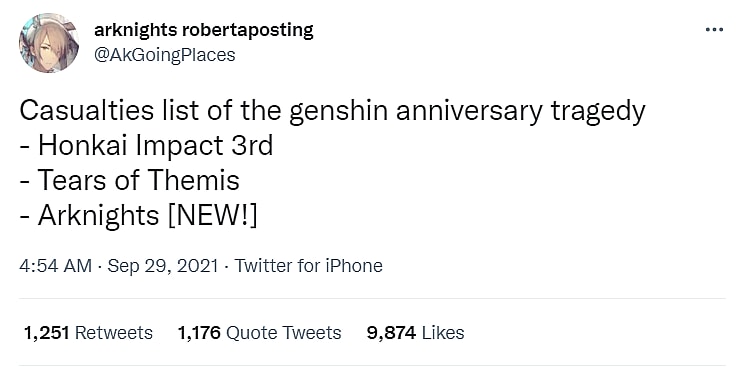 Despite this, Twitter user AkGoingPlaces reports a number of immature Genshin Impact players are going after miHoYo’s Honkai Impact 3rd, but they are also targeting Tears of Themis, and Arknights.