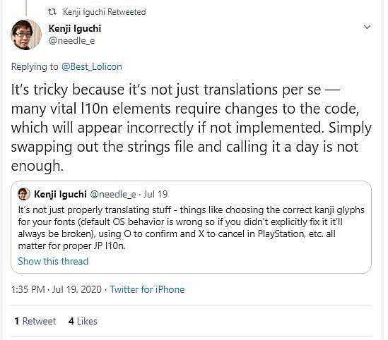 Iguchi would respond, “It’s tricky because it’s not just translations per se — many vital l10n elements require changes to the code, which will appear incorrectly if not implemented. Simply swapping out the strings file and calling it a day is not enough.”
