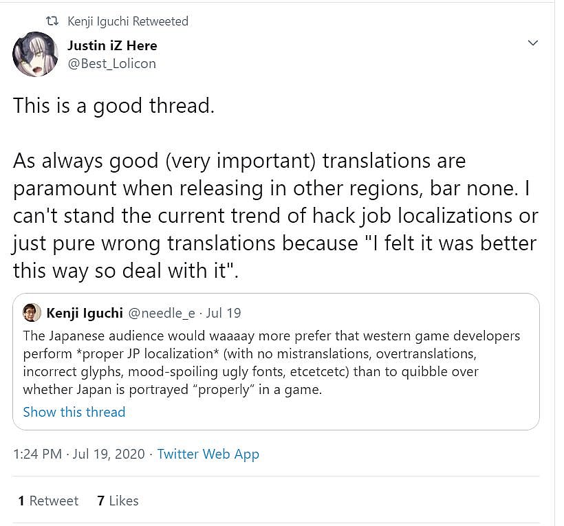 In a separate thread he would make a general statement about localizations in general in response to Twitter user Best_Lolicon.