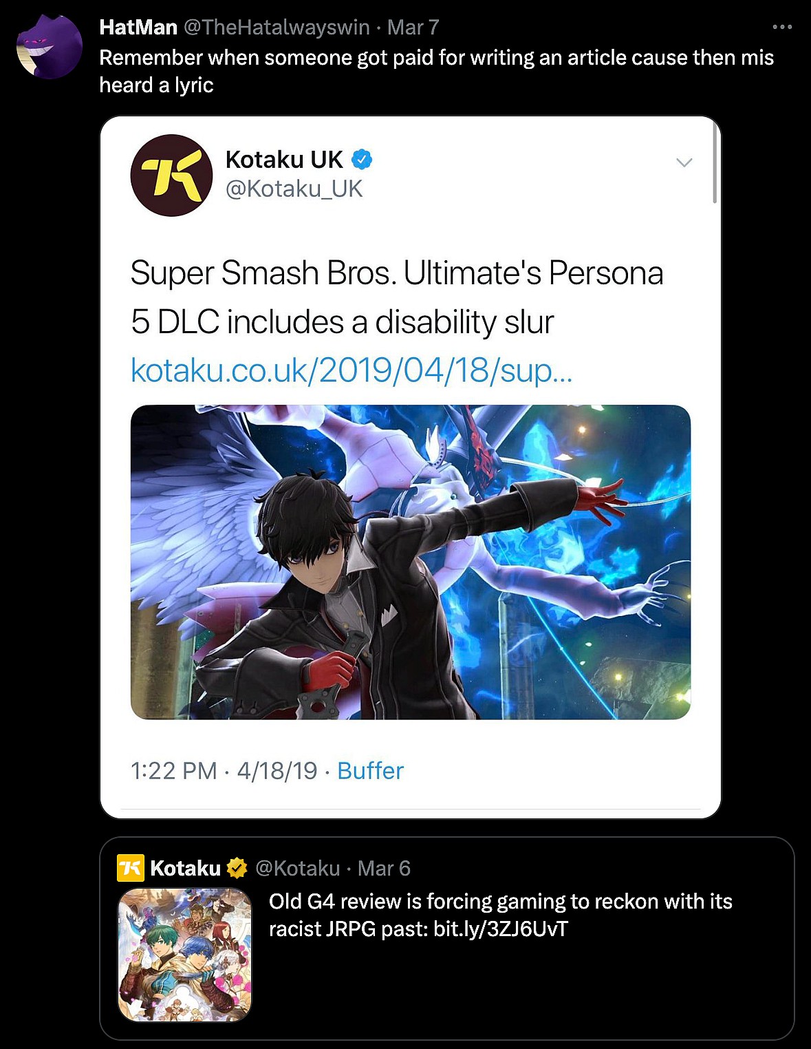 Bringing up the same Kotaku UK article claiming Atlus had included a disability slur in the Persona 5 DLC, @TheHatalwayswin pointed out, “Remember when someone got paid for writing an article cause then mis heard a lyric.