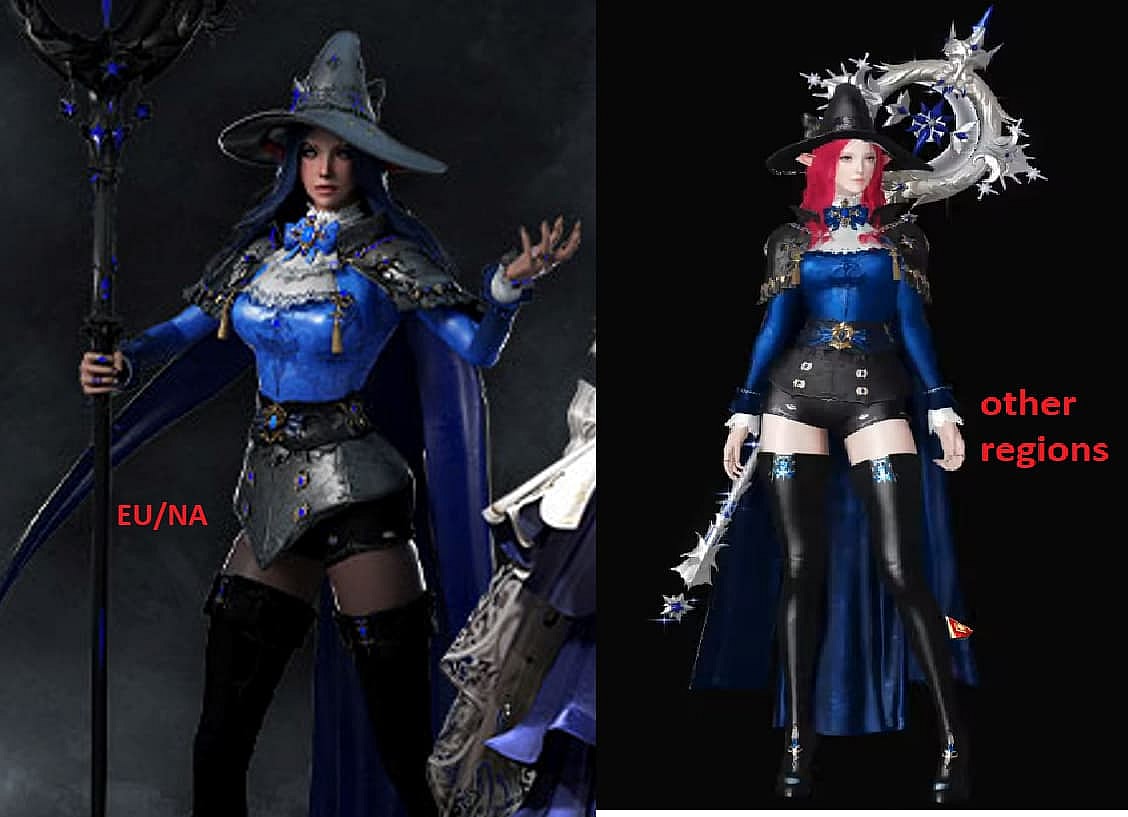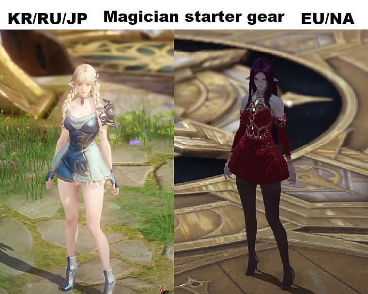 The Mage starting gear was almost entirely reworked, with the Western release adding tights, jewelry to cover the chest up to the neck, and even smaller details being entirely remade to the point it was an entirely new outfit:
