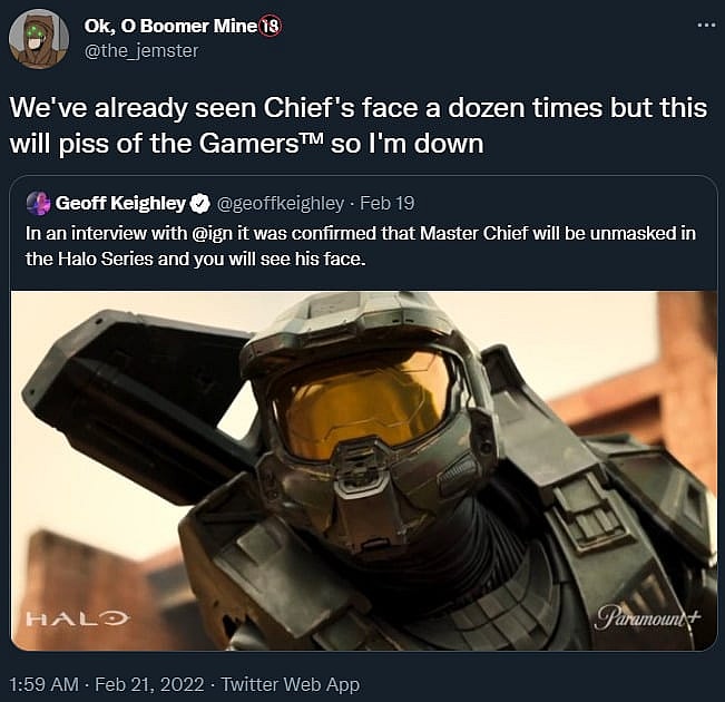 Not everyone was against the idea however, as @the_jemster reasoned, “We’ve already seen Chief’s face a dozen times but this will piss of the Gamers™ so I’m down.”