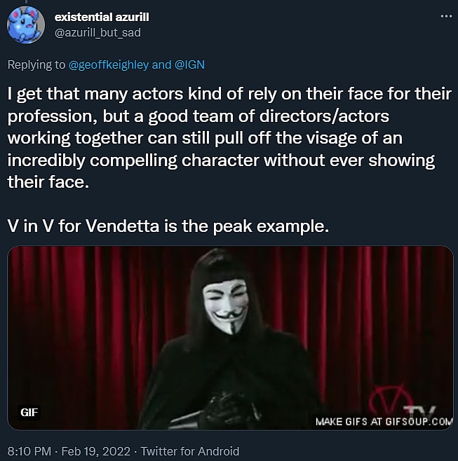 “I get that many actors kind of rely on their face for their profession, but a good team of directors/actors working together can still pull off the visage of an incredibly compelling character without ever showing their face,” @azurill_but_sad argued. “V in V for Vendetta is the peak example.”