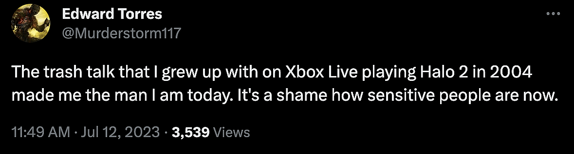 “The trash talk that I grew up with on Xbox Live playing Halo 2 in 2004 made me the man I am today,” declared @Murderstorm117, adding, “It’s a shame how sensitive people are now.”