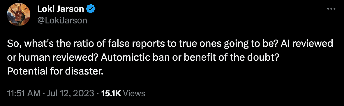 A fairly valid point was brought forward by @LokiJarson, who noted, “So, what’s the ratio of false reports to true ones going to be? AI reviewed or human reviewed? Automatic band or benefit of the doubt?”