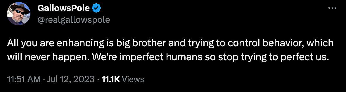 Twitter user @realgallowspole weighed in, asserting, “All you are enhancing is big brother and trying to control behavior, which will never happen. We’re imperfect humans so stop trying to perfect us.”