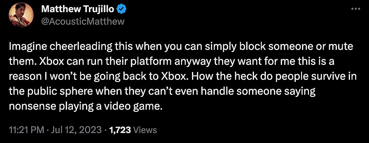 “Imagine cheerleading this when you can simply block someone or mute them,” pointed out @AccousticMatthew. “Xbox can run their platform anyway they want for me this is a reason I won’t be going back to Xbox.”