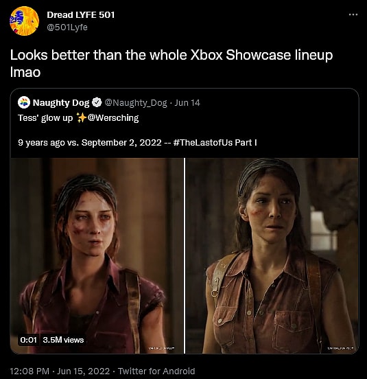 Offering his short and sweet approval, @501Lyfe commended, “Looks better than the whole Xbox Showcase lineup lmao”.