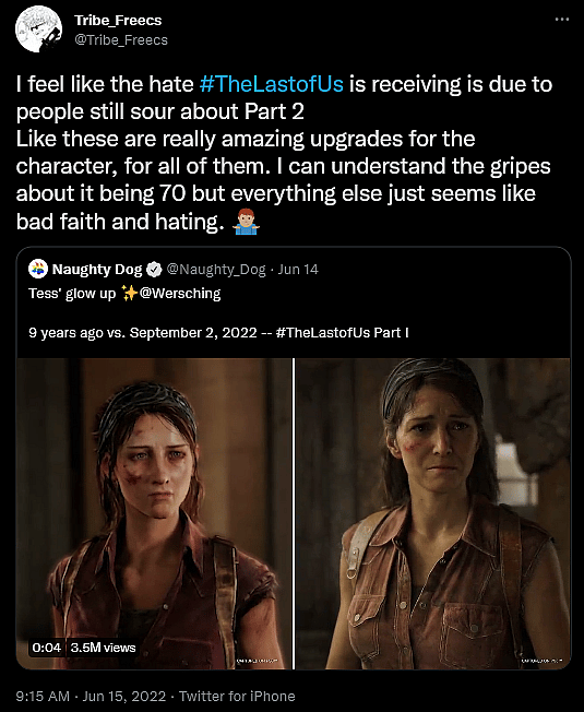 Referring to the sequel’s divisive story, @Tribe_Freecs theorized, “I feel like the hate #TheLastofUs is receiving is due to people still sour about Part 2.”