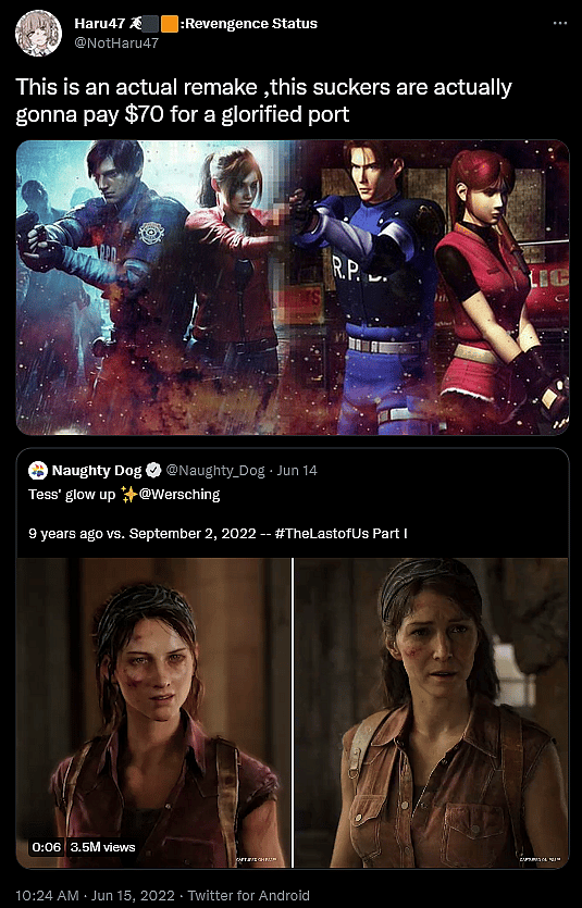 Comparing The Last of Us Part 1 to Capcom’s Resident Evil 2 REmake, @NotHaru47 mocked, “This is an actual remake, [these] suckers are actually gonna pay $70 for a glorified port”.