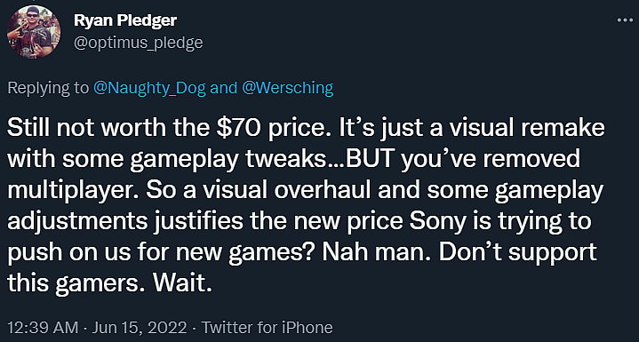 “Still not worth the $70 price,” @optimus_pledge denounced. “It’s just a visual remake with some gameplay tweaks…BUT you’ve removed multiplayer. So a visual overhaul and some gameplay adjustments justifies the new price Sony is trying to push on us for new games? Nah man. Don’t support this gamers. Wait.”
