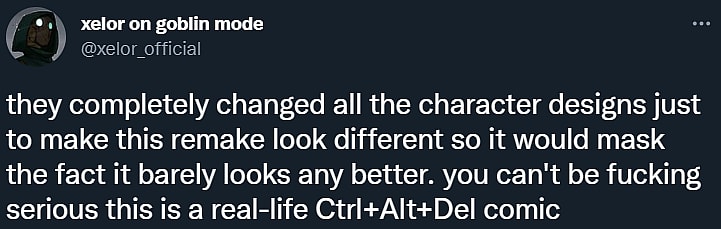 “They completely changed all the character designs just to make this remake look different so it would mask the fact it barely looks any better,” proposed @xelor_official. “You can’t be f—–g serious this is a real-life Ctrl+Alt+Del comic.”
