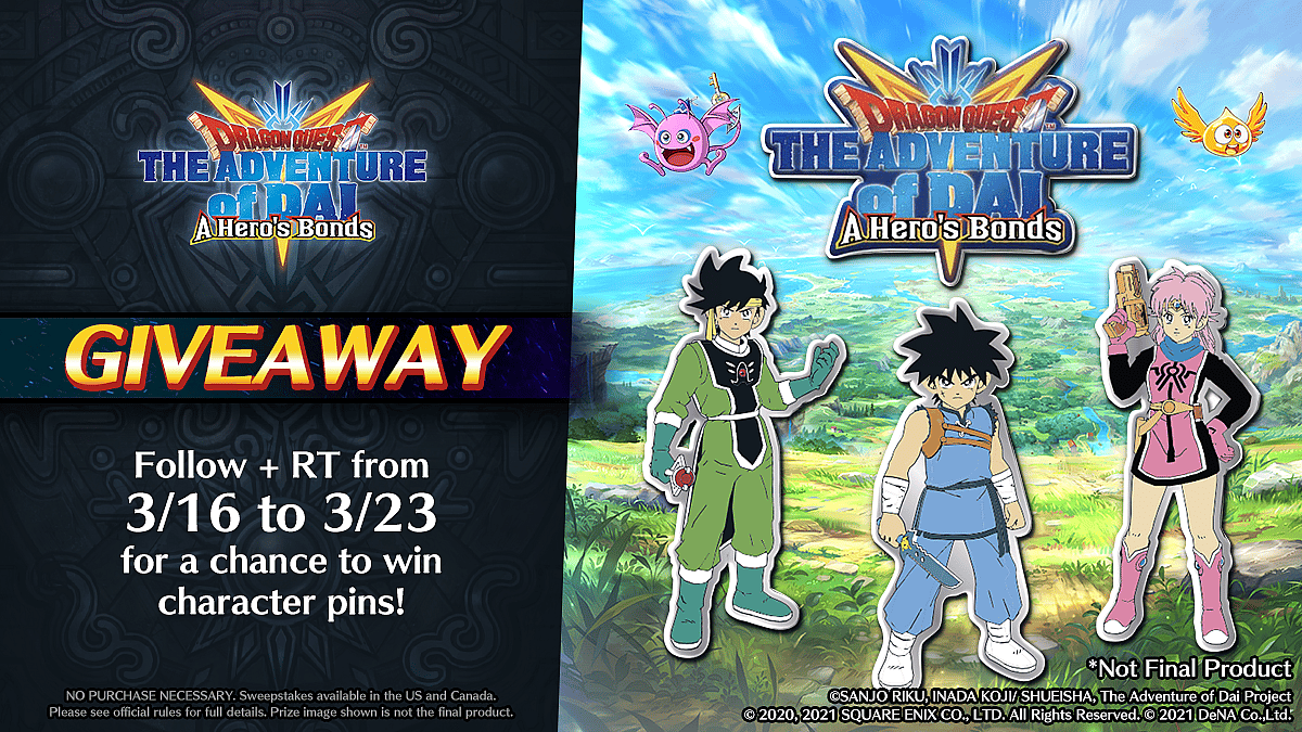 As part of their announcement, Square Enix also revealed a sweepstakes, where players who follow the official Dragon Quest The Adventure of Dai A Hero’s Bonds Twitter account and retweet the campaign tweet will be entered into a chance to win a pet set featuring the game’s characters.
