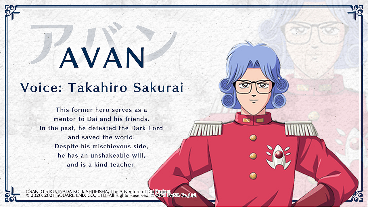 Avan is voiced by Takahiro Sakurai. He’s Dai’s mentor and previously defeated the Dark Lord and saved the world.