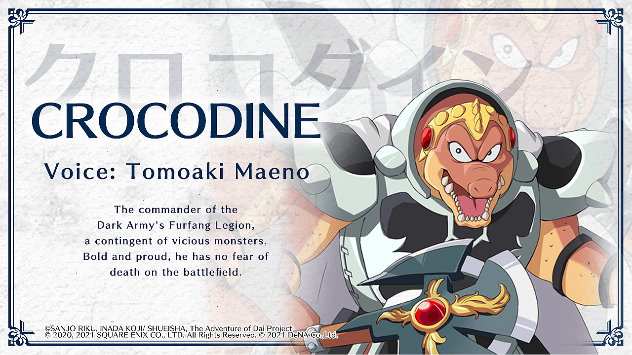 Crocodine is voiced by Tomoaki Maeno. He’s the leader of the Dark Army’s Furfang Legion.