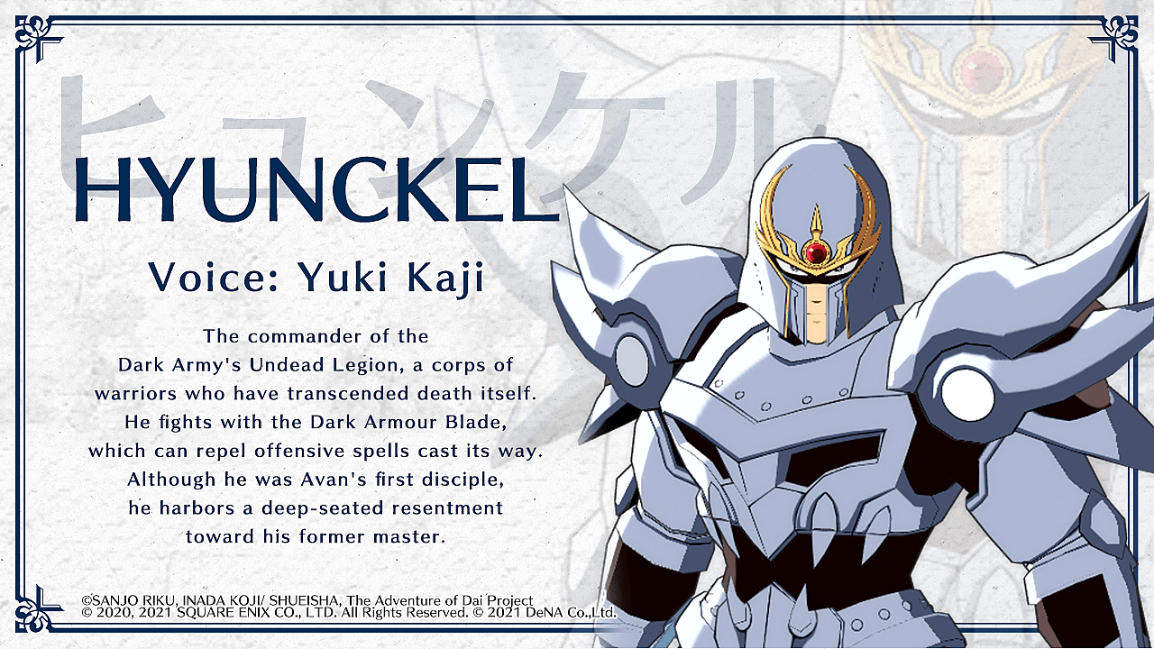 Hyunckel is voiced by Yuki Kaji. He’s the commander of the Dark Army’s Undead Legion. He wields the Dark Armour Blade in battle and was previously a disciple of Avan.