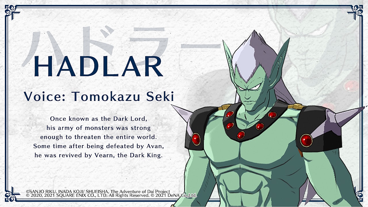 Finally, Hadlar is voiced by Tomokazu Seki. He was previously known as the Dark Lord, but has since been revived by Vearn and now goes by the Dark King.