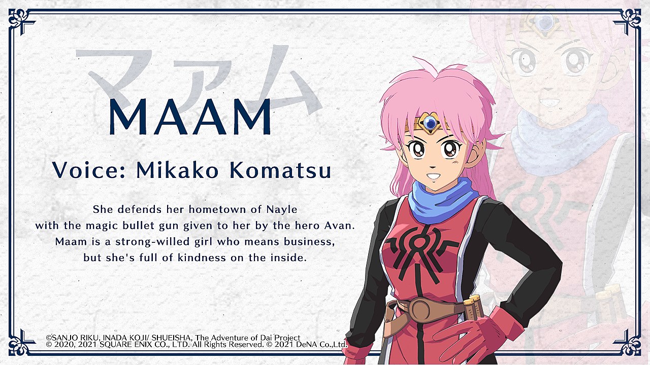 Maam is voiced by Mikako Komatsu and is the defender of her hometown Nayle. She defends the town with a magic bullet gun given to her by Avan.
