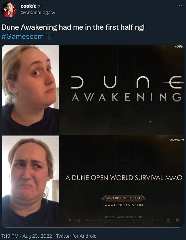 Sharing a meme to emphasize their disgust, @ArcanaLegacy mocked, “Dune Awakening had me in the first half ngl”.