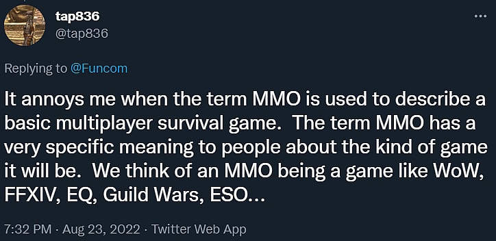 “It annoys me when the term MMO is used to describe a basic multiplayer survival game,” criticized @tap836. “The term MMO has a very specific meaning to people about the kind of game it will be. We think of an MMO being a game like WoW, FFXIV, EQ, Guild Wars, ESO…”