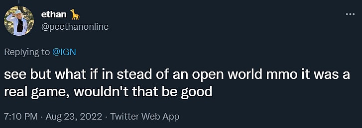 “See but what if in stead of an open world mmo it was a real game, wouldn’t that be good,” pleaded @peethanonline.