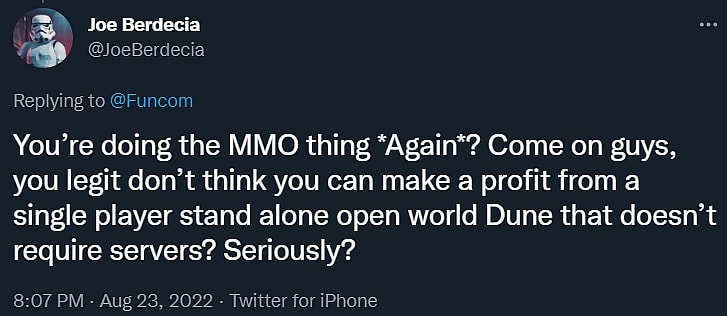 @JoeBerdecia questioned, “You’re doing the MMO thing *Again*? Come on guys, you legit don’t think you can make a profit from a single player stand alone open world Dune that doesn’t require servers? Seriously?”