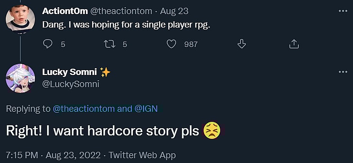 “Dang. I was hoping for a single player rpg,” lamented @theactiontom, who drew a response of “Right! I want hardcore story pls,” from fellow user @LuckySomni.