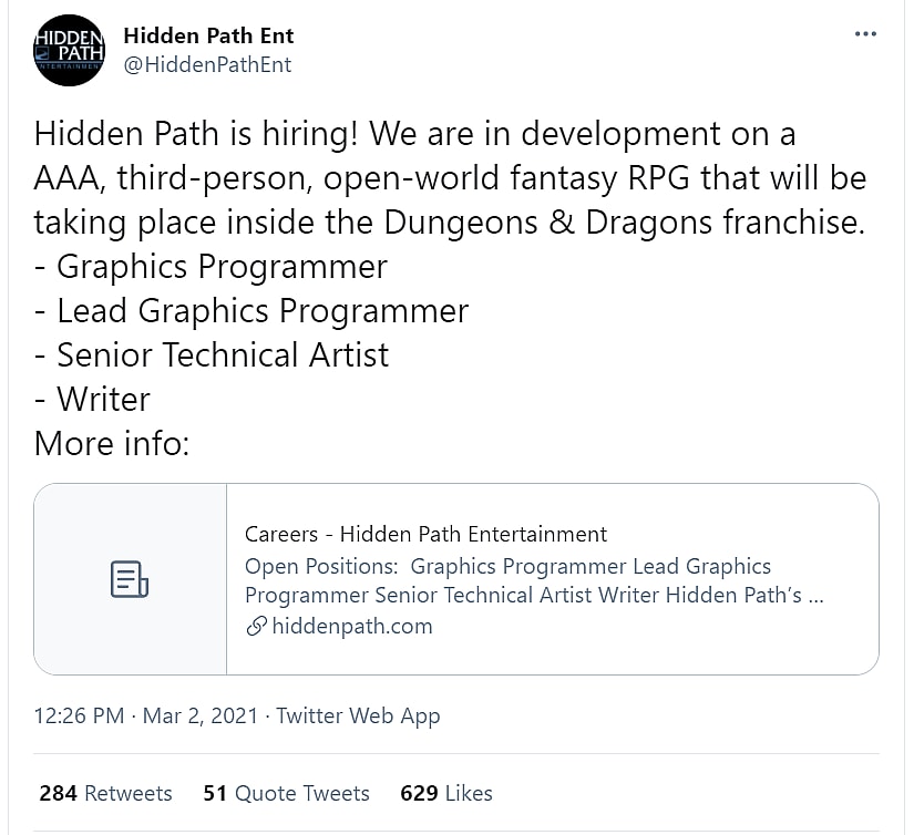 The full tweet reads, “Hidden Path is hiring! We are in development on a AAA, third-person, open-world fantasy RPG that will be taking place inside the Dungeons & Dragons franchise.”