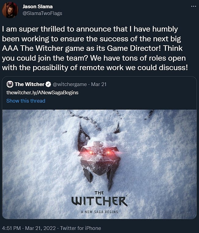Shortly after the new Witcher project’s announcement on March 21st, director Jason Slama took to Twitter to proudly boast of his involvement with the game, exclaiming to his followers, “I am super thrilled to announce that I have humbly been working to ensure the success of the next big AAA The Witcher game as its Game Director!”